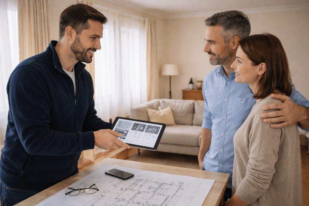 Si le projet est concret, nous organisons une visite à votre domicile. C’est une étape essentielle : nous relevons les mesures, identifions les contraintes techniques, échangeons sur vos attentes en matière d’aménagement, de matériaux et de budget. C’est aussi le moment où vous rencontrez la personne qui suivra votre chantier — car chez Acti Plus, votre interlocuteur reste le même du début à la fin.